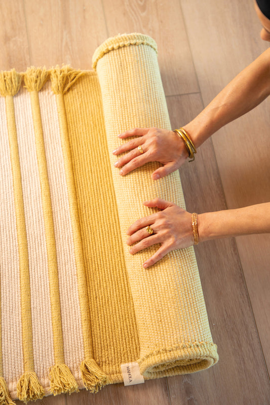 Das robuste, traditionelle Baumwollgewebe ist zudem sehr ästhetisch und verleiht Ihrem Teppich einen gewissen dekorativen Charakter. Sie müssen Ihre Yogamatte nicht mehr hinten im Schrank verstecken!